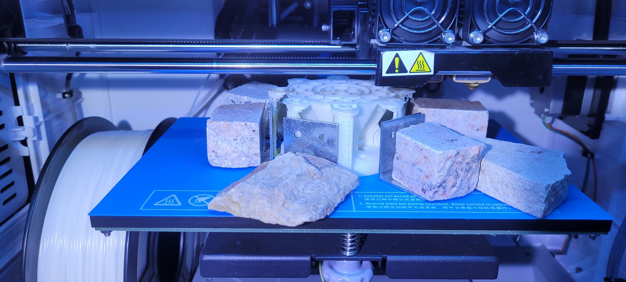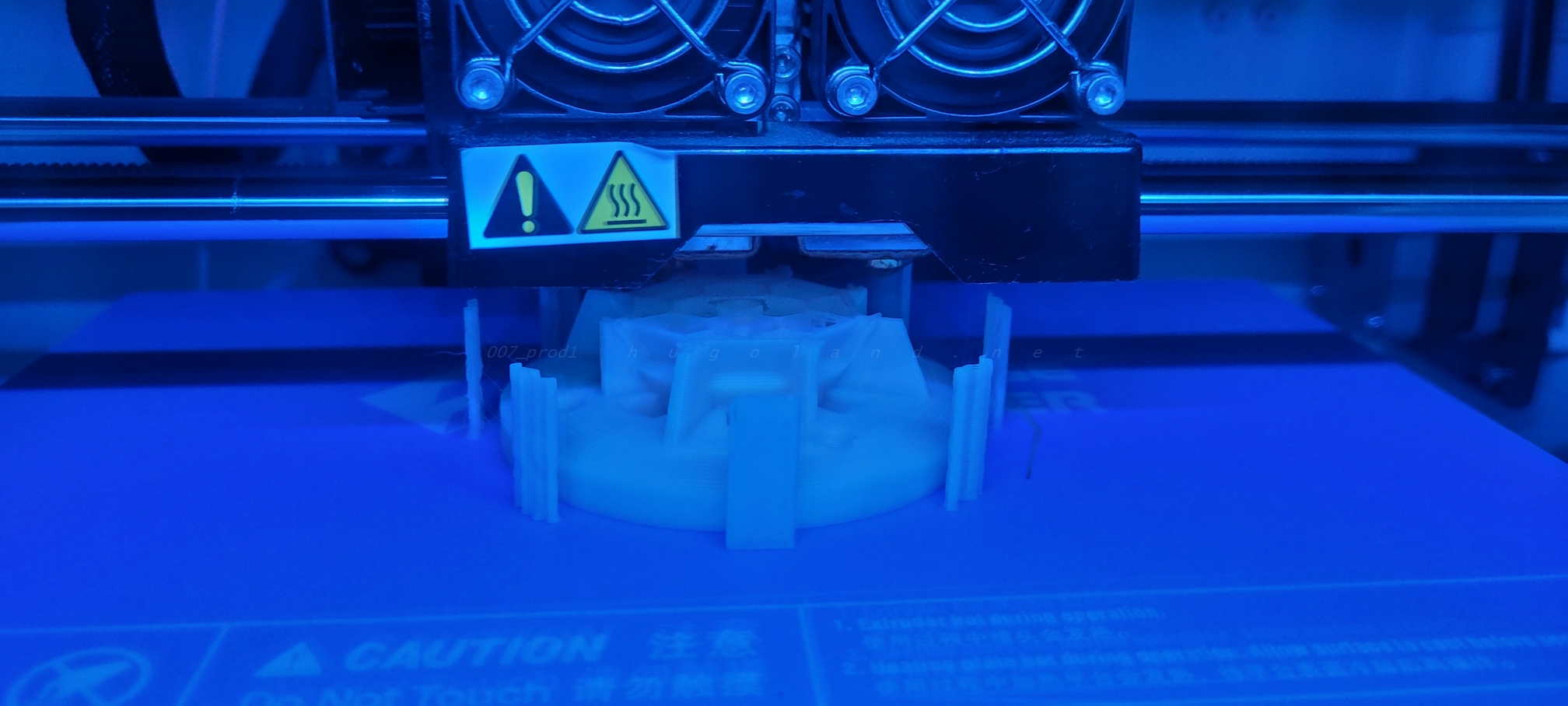 Les photos de l'impression du cône en plastique sont ci-dessous. Cette partie contient en bas un système pour y introduire et boulonner le tube PVC, et en partie haute un système pour visser l'autre pièce imprimée dont je parle plus bas. Quelque soit l'orientation de la pièce (à l'endroit ou à l'envers - ici le moins pire était d'imprimer la pièce à l'envers), trop de matière dépasse horizontalement, donc des piliers support étaient nécessaires (en l'occurrence, pour tenir le retour des éléments qui tiendront les radiales de la partie cône du discône). Cependant ceux-ci n'ont pas très bien collé au tapis, et j'ai dû ajouter en cours d'impression des petites cornières en acier lestées par des cailloux pour les retenir.